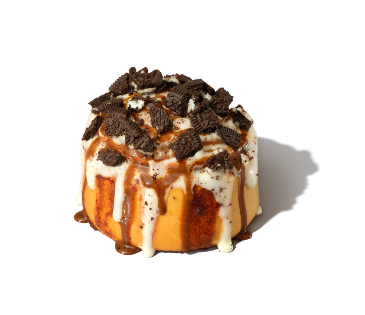 Our cinnamon roll with its bursting rich caramel flavour, smothered with our signature frosting and topped withcaramel drizzle then topped with OREO Cookie pieces .