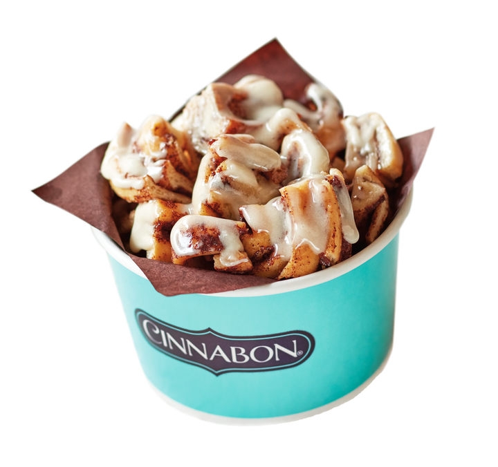 Classic roll cut into small pieces, easy to eat, and covered with caramel cream frosting, Choco, or cream frosting