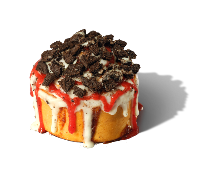 Our cinnamon roll with a bursting strawberry flavour, smothered with our signature frosting and then topped with OREO Cookie pieces